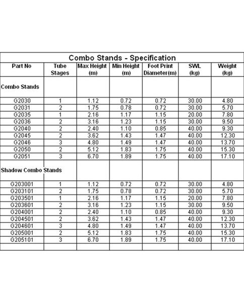 A range of nine stands with maximum heights from 1120 mm to 6.7m. As standard all the Combo Stands are finished in chrome plate and are fitted with a three function ‘Multihead’ top and ‘Lazy Leg’. All the stands are also available in ‘Shadow’ versions i.e. satin black powder coat finish.