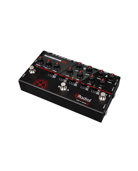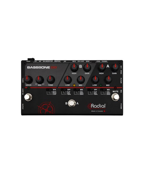 The Bassbone ODTM is a bass command center with two instrument input channels that are fully equipped with a semi-parametric equalizer and high-pass filter to eliminate low frequency resonance. Channel-A is set with a 22k-Ohm input impedance that is ideally suited for both passive and active basses. This is supplemented with a PZB booster that at once increases the output by 10dB and the load to 10 meg-Ohms to optimize it for use with piezo transducers. Channel-B is equipped with DragTM control load correction to optimize the tone and feel when using a vintage passive instrument. Toggling between channels is done using a footswitch and both channels may be mixed together by engaging the Blend switch. Outputs include a 1⁄4" stage amp out plus a balanced low-Z Radial DI box output to feed the PA system. A separately buffered tuner out works with the mute footswitch for quiet on-stage tuning. An effects loop with separate send & receive jacks enables multiple pedals to be used. This is augmented with an on-board overdrive with a wet-dry control that lets you add slight grit like an SVT or over the top distortion. The OD footswitch may be assigned to the loop, overdrive or both. Finally, a built-in headphone amp with 3.5mm output lets you use the Bassbone OD on the bus for those long drives between gigs.